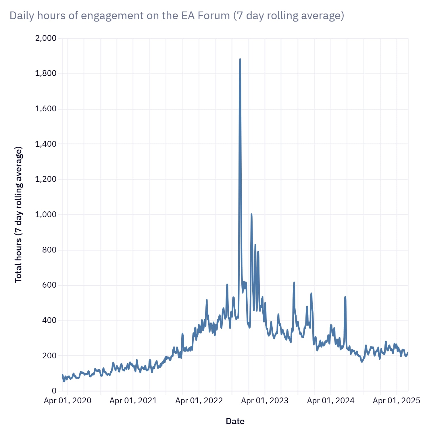 When I wrote that post, my role was focused on the EA Forum, and I had intended to spend the majority of my effort on the EA Forum. However, my role and my team are in flux right now, primarily in order to better align with CEAās strategy. Iām currently running the CEA Online Team, and so far in 2025 we've broadly been spending a smaller portion of our resources on the EA Forum over time[1]. I think we need to be careful, because I still believe strongly in what I wrote in my previous post, and I have a worry that reducing the resources we spend on the EA Forum does risk losing most of its value[2]. But there are always tradeoffs, and hopefully we can figure out the right balance between working on the EA Forum and working on other projects[3] in service of CEAās overall strategy.