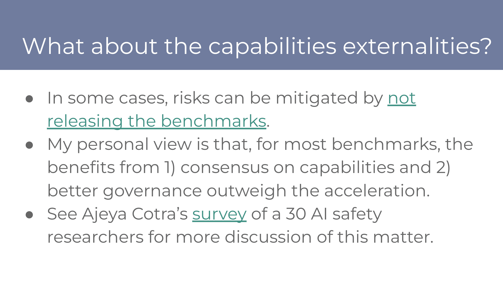 - Benchmarks could be harmful, via giving something for people to aim towards, and thereby accelerating research