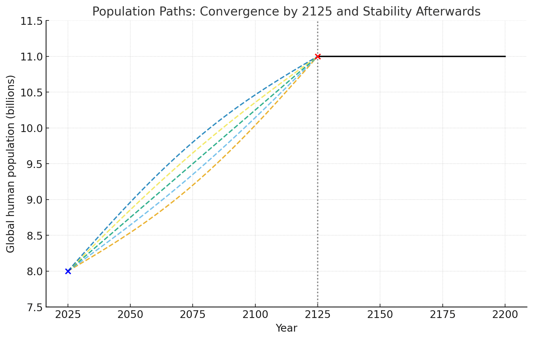 Saving human lives today changes the human population curve between 2025 and ~2125 (multiple possible paths represented by dotted curves). But in ~2125 , our impact (no matter in which direction it was) is canceled out.