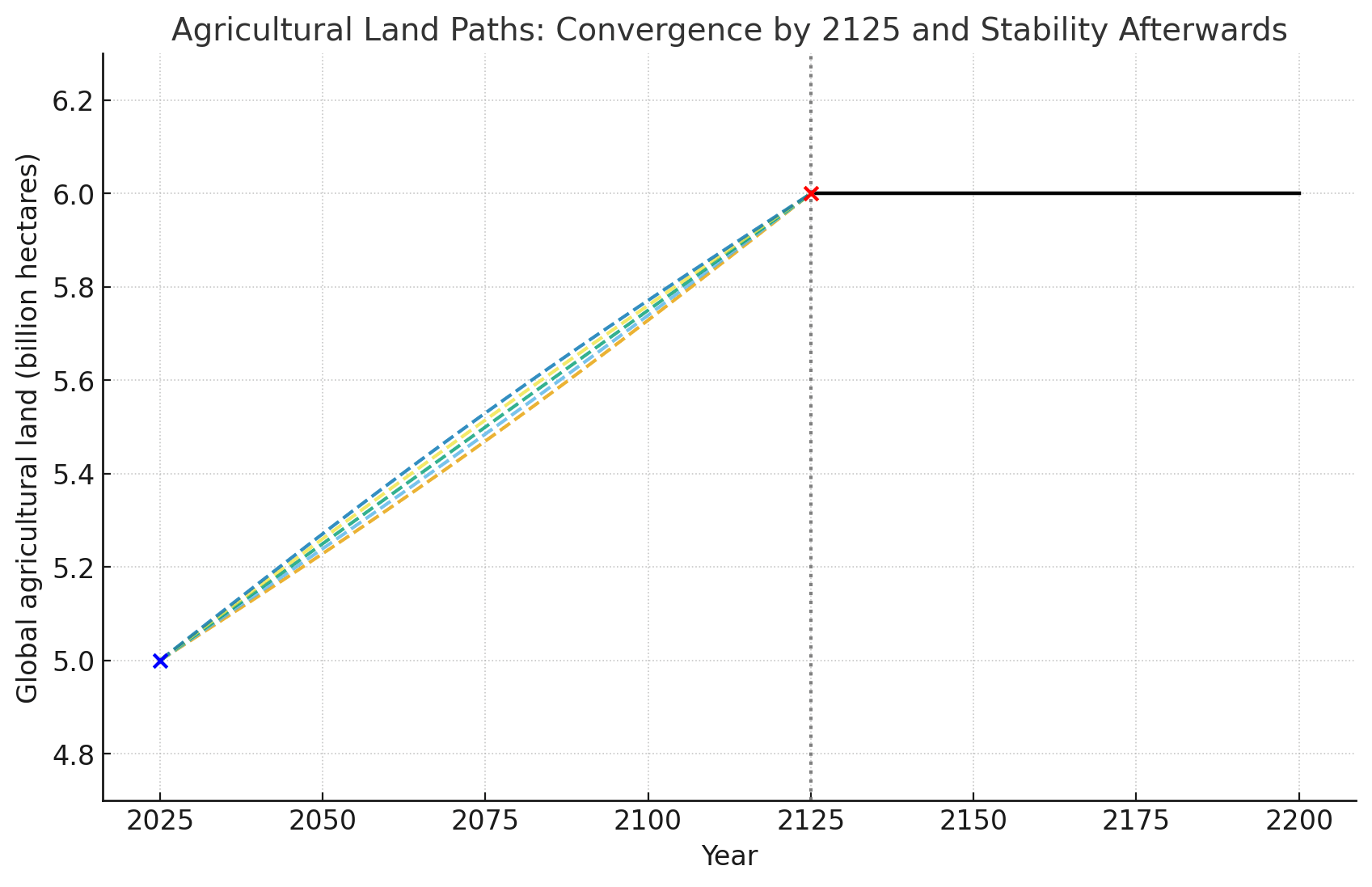 Almost no matter how many humans there are after ~2125, total agricultural land remains roughly the same.