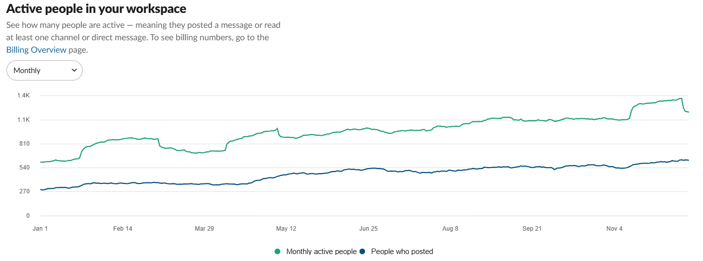 Throughout 2024, we had two amazing volunteers analyze various datasets around our Slack space. The goal was for us to find patterns and correlations that may potentially inform strategies to help make the Slack space easier to use and/or drive engagement. To date, three such analyses have been conducted: one on the Slack space as a whole, another on our onboarding approaches (including an experiment we ran), and a third on channel-specific engagement data. We were very optimistic about each of these - Slack already offers a ton of analytics and we were sure we’d find something valuable.