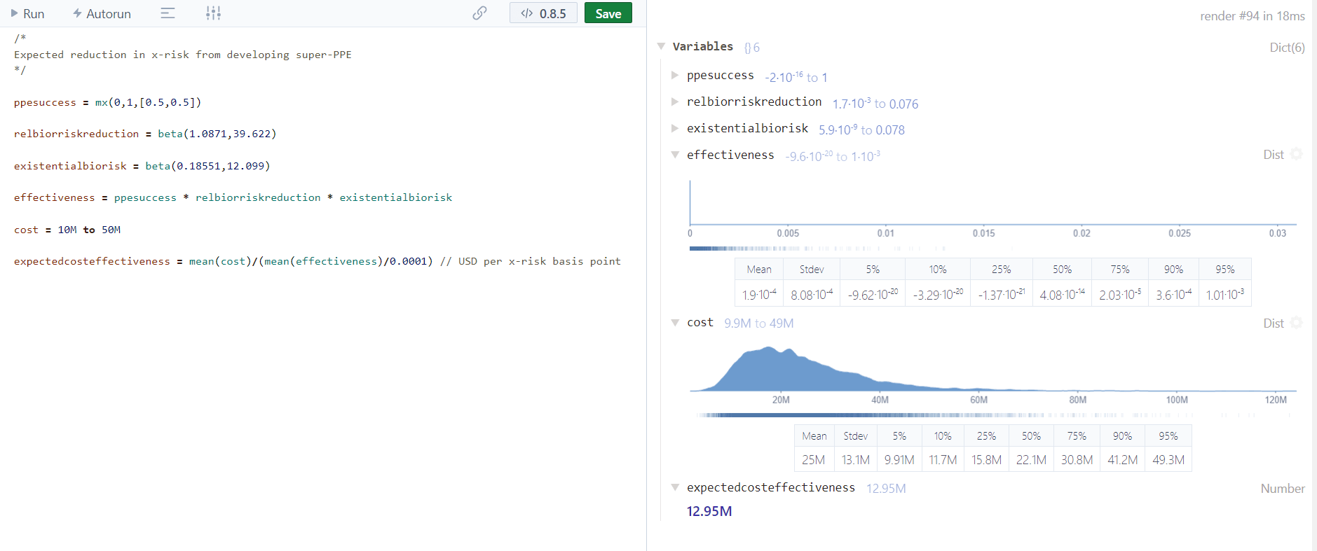 Using the same simplifying assumptions as in the previous section, I made a first-pass, extremely rough guesstimate model of the cost-effectiveness of developing type I PPE.