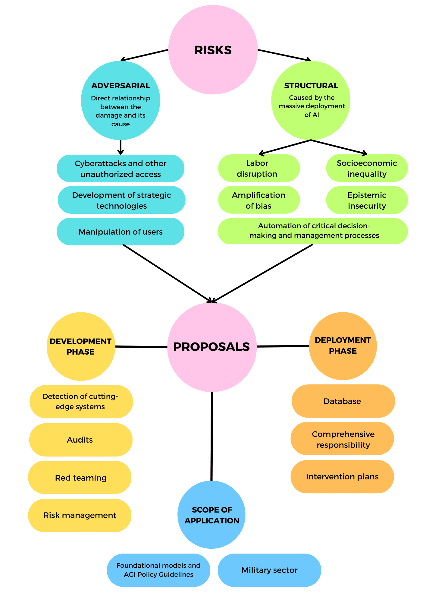 In terms of structural risks, we focus on five: (i) labor disruption, (ii) economic inequality, (iii) amplification of biases, (iv) epistemic insecurity, and (v) automation of critical decision-making and management processes. Labor disruption entails massive job loss due to automation. Economic inequality suggests that the accumulation of data and computing power might help AI developers concentrate wealth and power. Amplification of biases relates to the biases that algorithms may incorporate and generate in their decision-making. Epistemic insecurity indicates that AI can hinder the distinction between true and false information, affecting a country's socio-political stability and proper functioning. Finally, the automation of critical processes involves handing over command and control of strategic infrastructure to AI, increasing accidental risks.