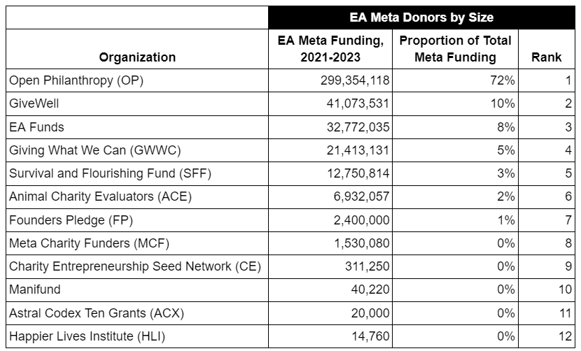 Open Philanthropy is by far the largest funder in the meta space, having given 299 million between 2021-2023; the next two biggest funders are GiveWell (41 million), which also receives OP funding, and EA Funds (which is also funded by OP to a very significant extent).
