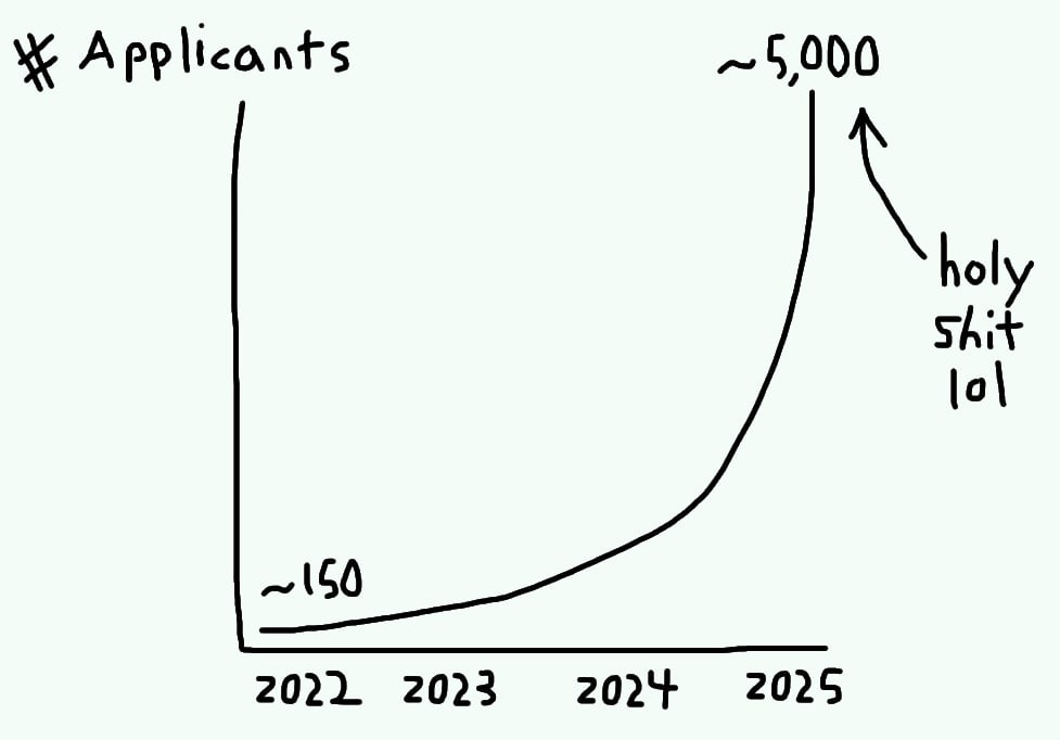 I’ve heard at least four examples in the last ~year or so of this dynamic playing out at AI safety organizations that run fellowship programs.1 This amount of applications isn’t the norm per se, but it happens often enough that we literally have an emoji in our Slack called :fellowship-growth: that we use to celebrate these cases.