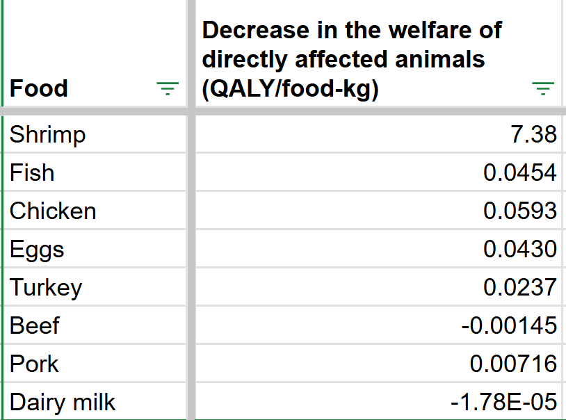 Thanks, Michael. Relatedly, below are my estimates of the decrease in the welfare of directly affected animals in QALYs per food-kg due to increasing the consumption of various animal-based foods.