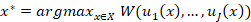 Suppose there is a set (X) of “attainable” states of the World . Naive cardinal utilitarianism suggest that given an aggregation functionW(.)-often simply a sum- and J members of the society each with a (possibly different) utility cardinal function on the states of the World, the social optimum is simply the point (attainable state of the world) that maximizes aggregate utility: